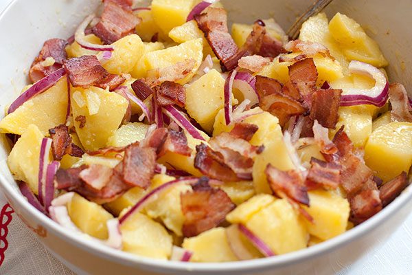 В этом салате нейтральный вкус картофеля дополняется более яркими по вкусу продуктами, которые уравновешиваются и объединяются мягкой заправкой.