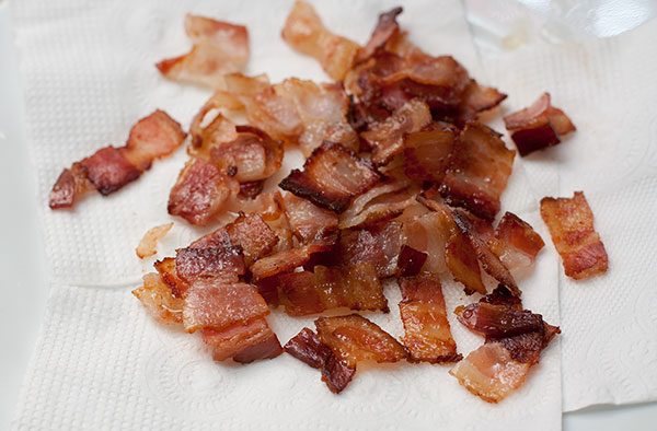 Готовый бекон положите на бумажную салфетку, чтобы убрать лишний жир.