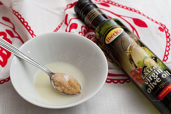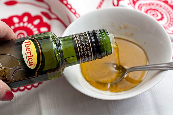 Добавьте оливковое масло холодного отжима Iberica Extra Virgin и интенсивно перемешайте, чтобы получилась однородная смесь. Попробуйте, заправка должна быть довольно интенсивного, но гармоничного вкуса.