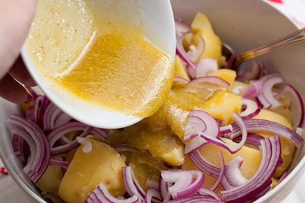 Добавьте заправку в салат и осторожно перемешайте, стараясь не повредить куски картофеля.