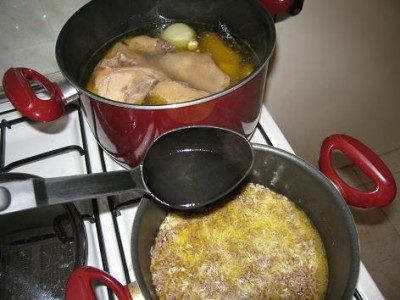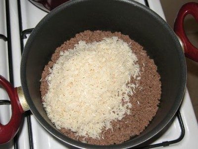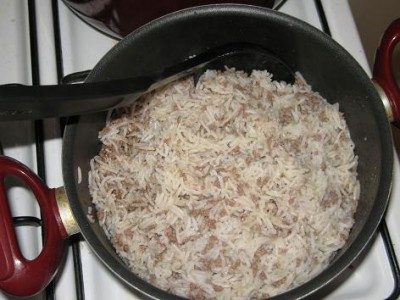 Когда рис с фаршем настоятся, влить два стакана бульона, посолить и поставить вариться как обычный рис.
