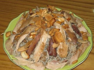 Когда рис будет готов можно собирать блюдо: На большую плоскую тарелку выложить горкой рис с фаршем, распределить на горке куски куриного мяса, посыпать орешками и корицей.