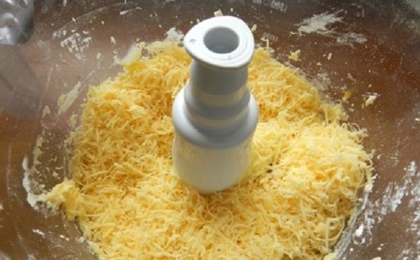 Твердый сыр измельчите в блендере. Лучше выбирать не слишком соленый сыр, подойдет — сливочный. Холодное масло с мукой и желтком размешайте в блендере.