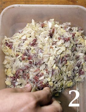 2. Для начинки берем куски свинины, баранины и говядины в равных пропорциях. Мясо и жир мелко рубим ножом. Также мелко рубим картофель, кинзу и лук. Все тщательно перемешиваем, добавляем соль, перец по вкусу.