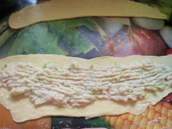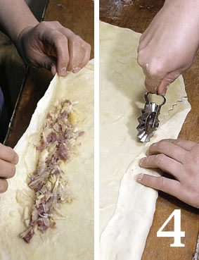 4. Вдоль пласта из теста выкладываем начинку полоской от края до края. Заворачиваем начинку другим, свободным краем пласта, затем фигурным ножом-роликом отрезаем эту заготовку от большого пласта теста.