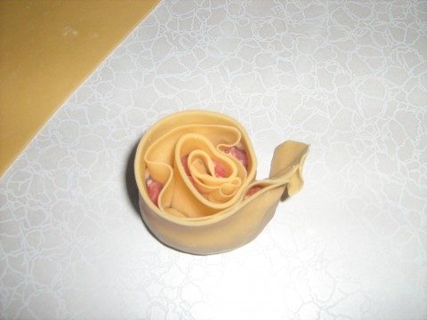 Хвостик хорошо защипнуть, уголочек кончика аккуратно заправить под розочку (т.е. края полосы закрепляем сбоку, над выпуклостью с начинкой)
