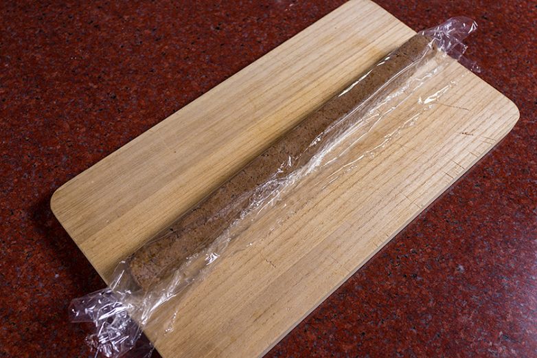 Мы скатали фарш для ляванги в колбаску, завернули его в пищевую пленку и охладили, почти заморозили.