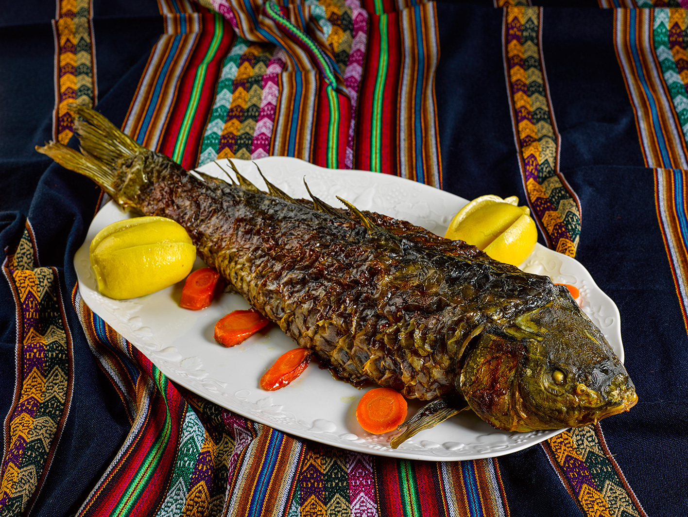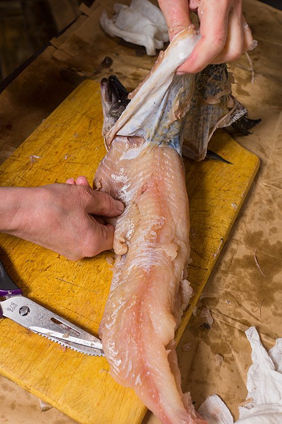 Вот снять шкуру с карпа несколько сложнее. Но есть хитрость — возьмите две салфетки, удерживайте скользкую шкуру карпа одной рукой, а плоть — другой. Там, где мясо остается на шкуре, осторожно подрезайте ножом.