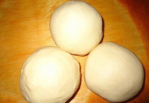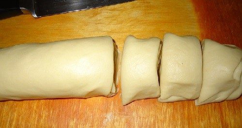 Все скрутить в тугой рулет. Рулет разрезать на куски шириной 4-5 см. Каждый кусок раскатать в лепешку. Перед раскатыванием кончик одного слоя (должно получится три) подтянуть к серединке, закрыв отверстие, и только потом раскатать. Края лепешки должны получиться тоньше серединки.