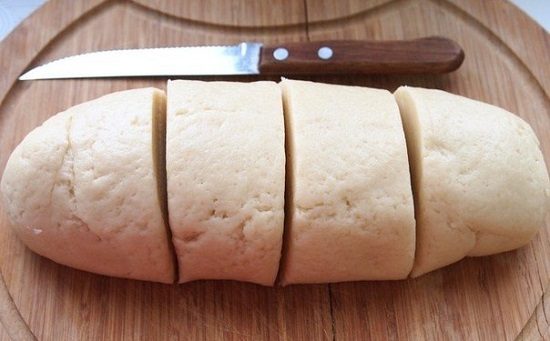 Добавьте оливковое масло, просейте муку и замесите эластичное тесто. Разрежьте на 4 части.