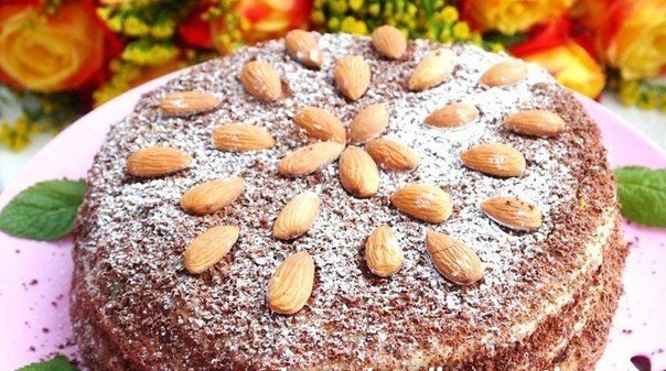Украсить тортик можно тертым шоколадом и миндалем. Или кокосовой стружкой, тогда тортик получится беленьким. Дайте ему пропитаться 2 часа в холодильнике — и можете заваривать чай!