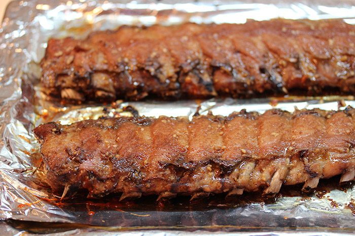 Отправляем в духовку, на верхнюю полку, под «гриль». Теперь фольгой уже не закрываем, конечно. С каждой стороны нужно подержать ребрышки минут по 10, до того момента, пока соус не начнет слегка обугливаться. В результате получаем лучшие в мире вкуснейшие свиные ребрышки барбекю. Мясо должно практически отваливаться с кости и таять во рту.