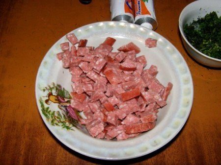 2. Порезать колбасу и пошинковать лук, морковь, чеснок и зелень.