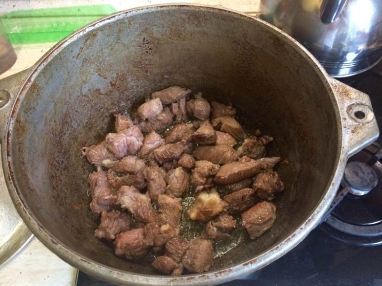 В раскаленном масле обжариваем мясо, постоянно перемешивая, ждём пока слегка подрумянится.
