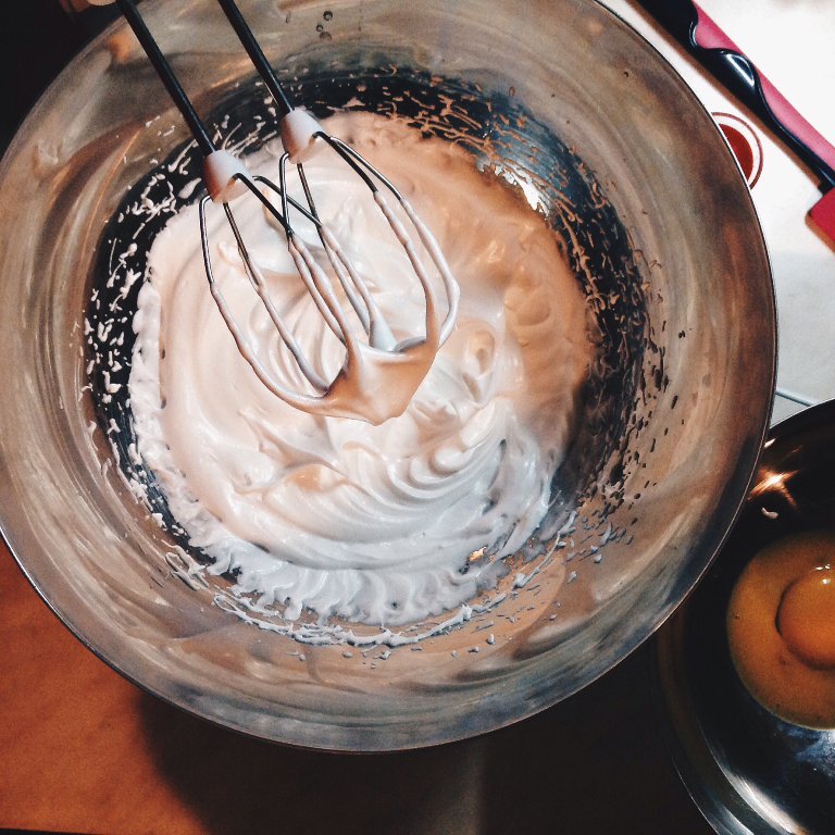 Отделяем белки от желтков. Белки взбиваем с сахаром до пиков.
