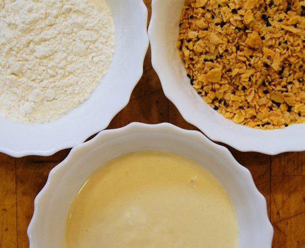 А дальше обмакиваем в кляр и присыпаем кукурузными хлопьями.