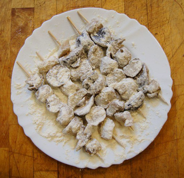 Шашлычки панируем в муке. Даем малёха отлежаться.