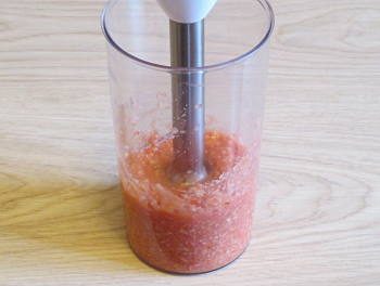 Если вы готовите небольшое количество горлодера и/или просто не хотите гонять мясорубку, то воспользуйтесь блендером. Помидоры можно измельчить в любой чаше быстроходными ножами, но вот зубчики чеснока и, особенно, кусочки хрена в подходящую по консистенции кашицу способна превратить только погружная насадка блендера, при этом в стакан блендера нужно положить и некоторое количество кусочков помидоров.
