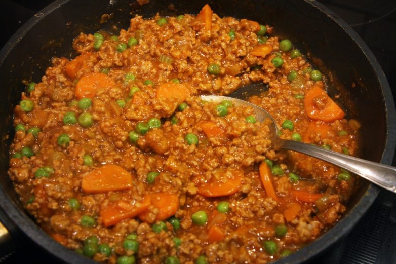 Это не только фарш, но еще и разные овощи, томатная паста и густой мясной соус. И горошек, конечно же!