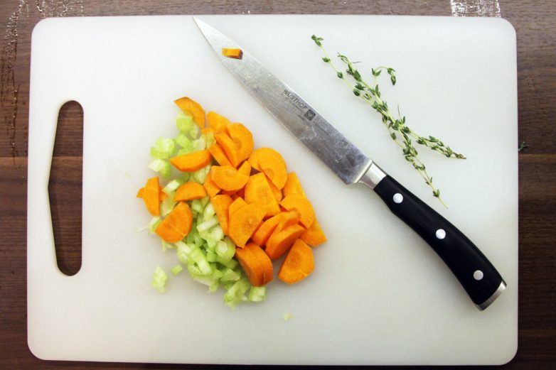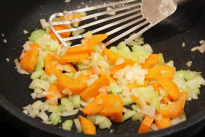Сначала мелко шинкуем луковицу, а сельдерей и морковку режем на небольшие брусочки.