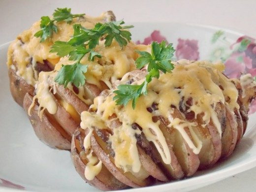Достав картошку-гармошку, украсим зеленью петрушки и тут же, горячей, подаём к столу.