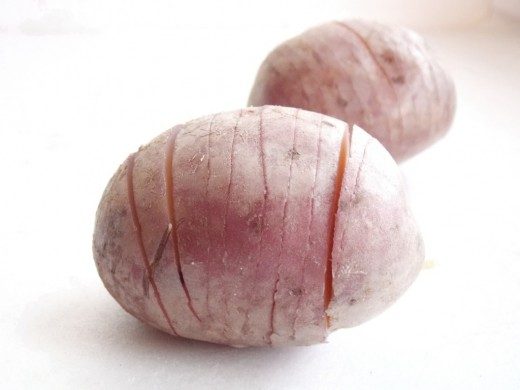Обсушив картошку на полотенце, делаем надрезы поперек, но не до конца, через 3-4 мм. Если случайно отрезали кусочек картошки – не страшно, можно закрепить его зубочисткой. Только потом, перед тем, как кушать, вытащите её.
