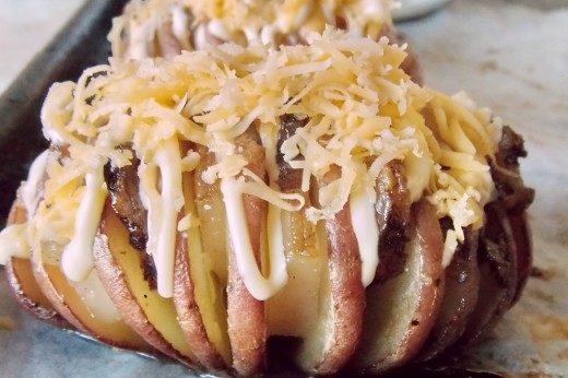 Но это ещё не всё. Достаём противень с картошкой, каждую чуть поливаем сметаной или майонезом, посыпаем чесноком и сыром, натёртыми на мелкой тёрке. И ставим обратно в духовку ещё на несколько минут, пока расплавится сыр.