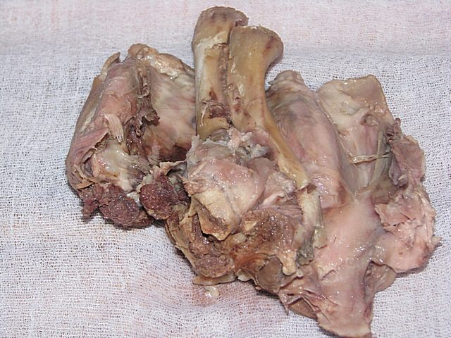 Поостывшую рульку, уложив на чистую марлю, разваливаем вот таким образом, вынимая кость.