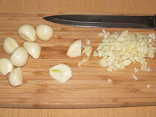 Сами в это время мелко режем чеснок. Кто давить через давилку будет – не зачет! Только нарезка.
