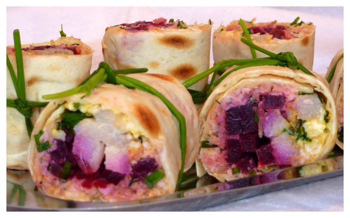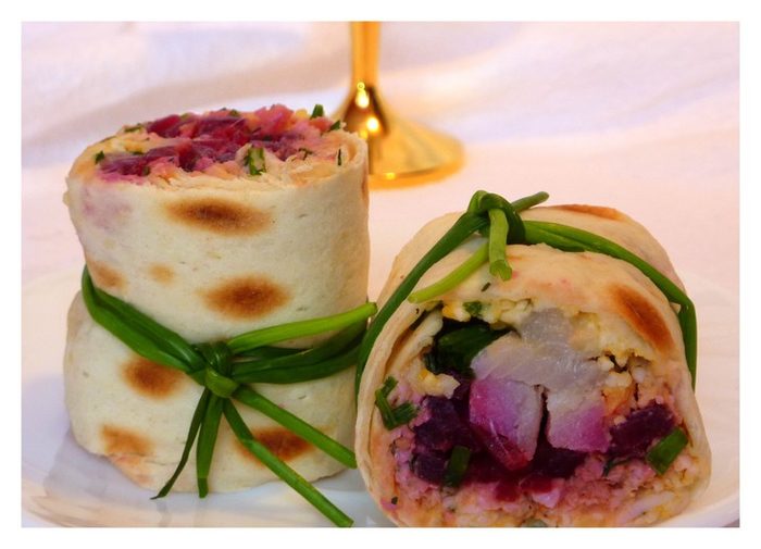 Положите на лаваш тонким слоем яичную массу с луком, примерно до половины лаваша, затем положите нарезанную свеклу, (можно смазать ремуладом или майонезом, но я не делала). По центру кладём кусочки сельди и аккуратно сворачиваем в ролл. Можно оставить немного полежать, затем острым ножом нарезаем полученный ролл на маленькие роллы толщиной около 3-х сантиметров. Для оформления можно перевязать роллы шнит-лучком или украсить веточками укропа, подаём к столу.