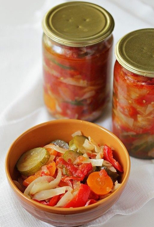 Ингредиенты: капуста белокочанная 1 кг, морковь 1 кг, огурцы 1 кг, перец болгарский 1 кг, лук 1 кг, помидоры 3 кг, сахар 1 стак., соль 90 г, масло растительное 250 г, перец черный 8-10 горошин, лавровый лист 5 шт., уксус 9% 150 мл