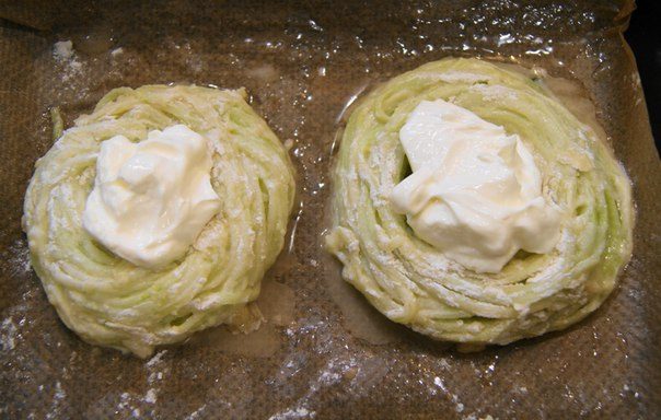 Из пучков вьем «гнезда», обмакиваем их яичную болтанку и панируем в муке.
