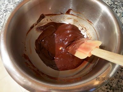 В два приема очень осторожно вмешиваем в шоколадную смесь оставшиеся белки. Перемешиваем лопаткой движениями по кругу и снизу вверх.