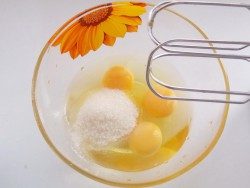 В отдельной ёмкости взобьём миксером сахар с яйцами – до тех пор, пока масса увеличится в объёме и станет очень пышной.