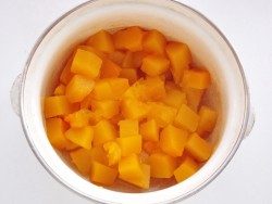 Сначала подготовим тыкву. Если добавить её в тесто кусочками или тёртую, получится совсем другой вкус – более плотная и влажная структура. Для пышного и воздушного теста нужно добавлять тыквенное пюре. Поэтому очищаем тыкву и нарезаем кубиками 1-1,5 см, выкладываем в кастрюльку, на дно которой налито немного воды, и тушим под крышкой на огне меньше среднего (чтобы не пригорела) до мягкости, около 7-10 минут. Если вода выкипает, подливаем чуть-чуть; если тыква уже готова, а на дне осталась жидкость – сливаем излишек. С помощью толкушки для картошки или блендера делаем из тушёной тыквы пюре и оставляем до остывания.