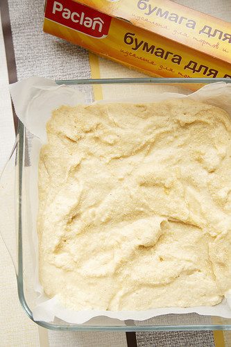 Форму выстелить бумагой для выпечки. Выложить в нее тесто.