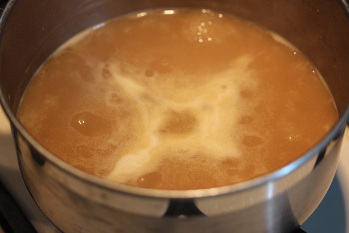 Готовим «ру» — растапливаем сливочное масло, и на малом огне вмешиваем туда просеянную муку, чтобы получилась паста консистенции густой сметаны. Постоянно помешиваем, не давая пригореть, и доводим до золотистого цвета и орехового запаха. Добавляем бульон, перемешиваем до однородности, доводим до кипения и даем покипеть на малом огне, пока не упарится примерно на 1/3.