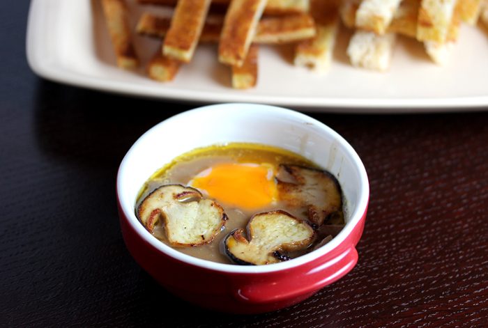 Теперь заливаем аккуратно соус в кокотницу, яйцо при этом должно как бы всплыть. Сверху выкладываем жареные грибы.