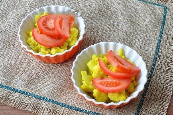 В самом начале нужно пробланшировать цветную капусту, чтобы освежить ее цвет. Также можно добавить в воду куркуму.
