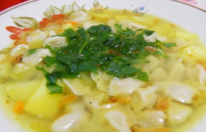 Положи пельмени в бульон и вари до готовности. Добавь в суп сушеную мяту.