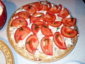 Снова накрываем промазанным блином и выкладываем третий слой из помидоров с зеленью.