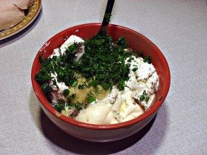 Пока у нас жарятся грибы, варятся яйца и курица, необходимо приготовить творожную массу для смазывания блинов. Для этого смешиваем творог, майонез, рубленную зелень и очищенные зубчики чеснока, пропущенные через чеснокодавку.