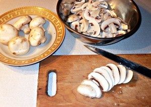 Шампиньоны промываем холодной водой и режем на тонкие пластинки.