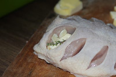 7. В каждый разрез положить брусочек сливочного масла, веточку тимьяна и по несколько пластинок чеснока.