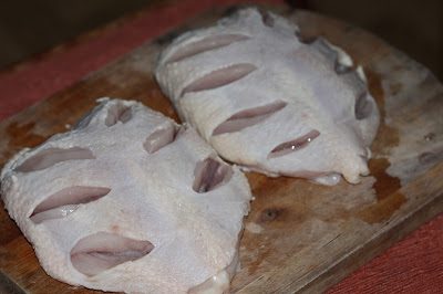 1. Куриные грудки помыть и обсушить. Сделать в грудках глубокие надрезы с двух сторон и посолить грудки.