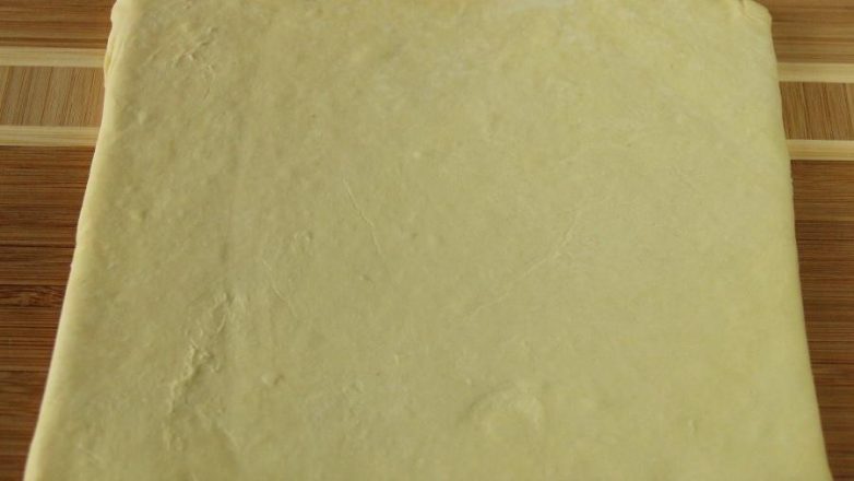 Когда оно станет мягким, посыпаем стол мукой и раскатываем тесто до толщины примерно в 3 мм. Сверху на тесто плотным слоем выкладываем отбитое куриное филе.