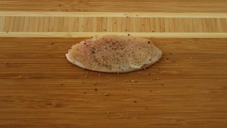 Если готовим без маринада, то после того, как мясо отбили, его нужно посолить и поперчить свежемолотым черным перцем (по вкусу).