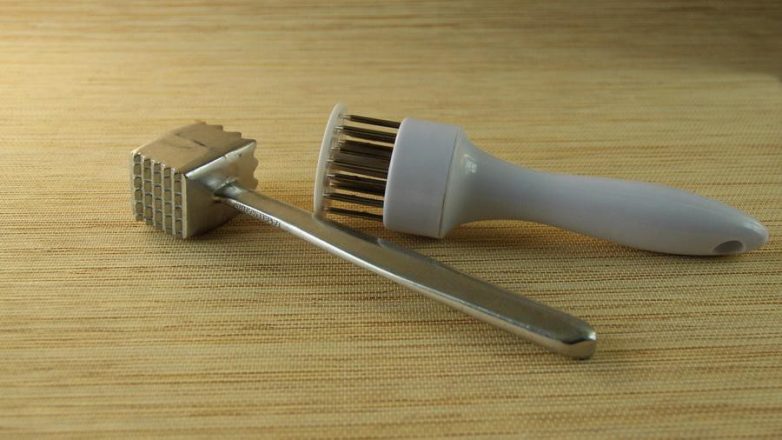 Я предпочитаю использовать тендерайзер. После недолгих экспериментов стало понятно, что по вкусу и качеству готовое мясо не отличается, а вот процесс готовки с ним гораздо приятнее: от ударов молотком очень много брызг, с тендерайзером же такой проблемы нет.