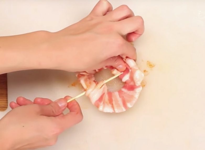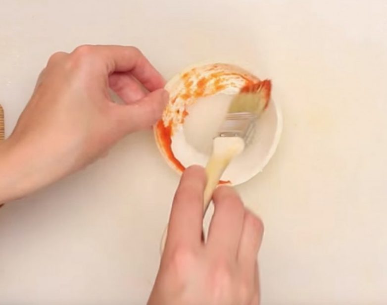 Отдели 2-3 кружочка, как показано на фото. Теперь всё хорошенько смажь соусом чили с помощью кисти.