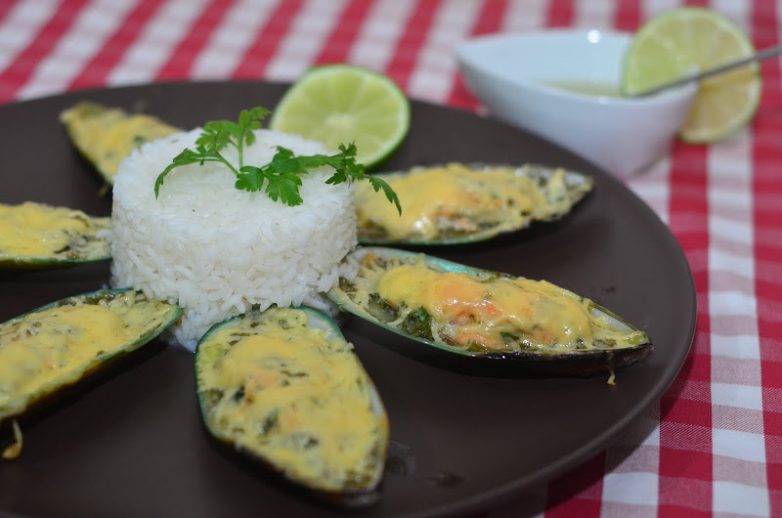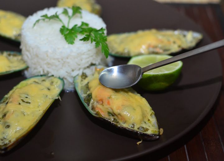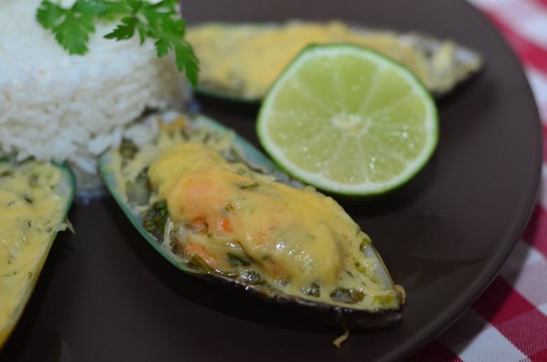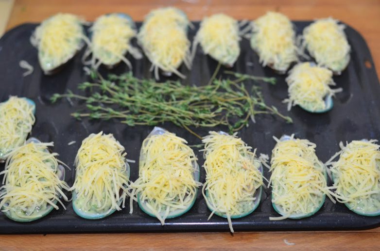 10. Разогреваем духовку до 180 градусов. Далее раскладываем мясо мидий по ракушкам, следите чтобы мясо соответствовало размеру ракушки.